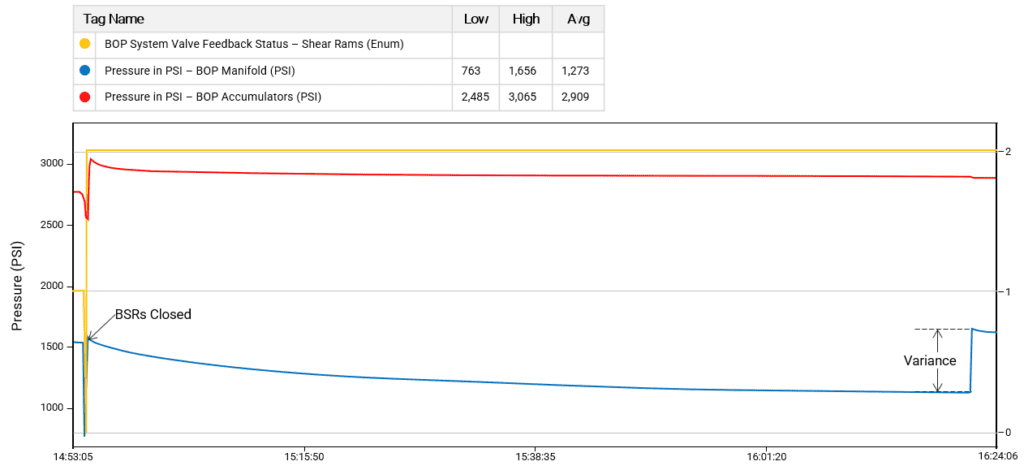 In this example, the issue was with the BOP manifold regulator, which was supplied with 3000 psi from the accumulator bank. The manifold regulator reduces the supply pressure to 1500 psi for operation of the BOP pipe rams, blind shear rams (BSRs), and choke and kill valves. While monitoring the accumulator, the BOP analyst noticed that the manifold regulator showed an increased leak off rate after the BSRs were functioned closed (see graph below). In this case, the 1,500 psi manifold regulator pressure was deviating by more than 25 percent. Although it is not uncommon for a regulator’s pressure to vary, the BOP analyst knew that the level of deviation likely indicated an eminent component failure or a leak in the hydraulic circuit.